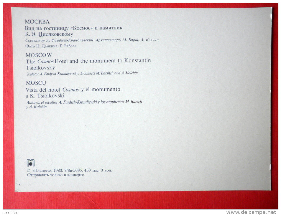 The Cosmos Hotel and the monument to Konstantin Tsiolkovsky - Moscow - 1983 - Russia USSR - unused