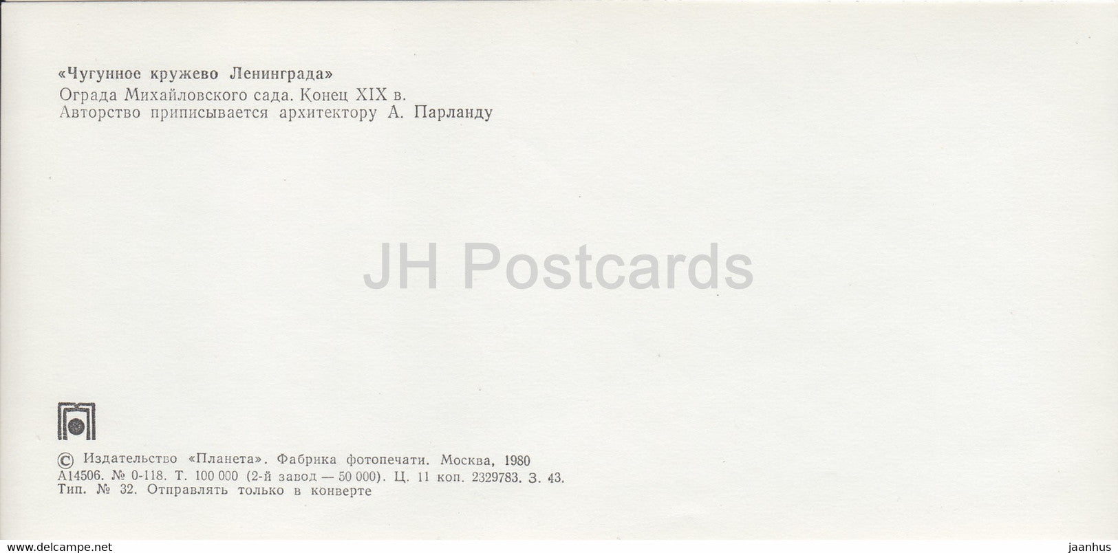 the fence of the Mikhailovsky Palace -1 - St Petersburg - Cast Iron Lace of Leningrad - 1980 - Russia USSR - unused