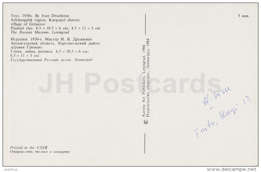 Toys , Arkhangelsk Region - Russian Folk Toys - 1984 - Russia USSR - unused