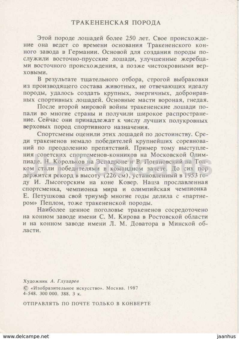Trakehner horse - illustration by A. Glukharev - horses - animals - 1988 - Russia USSR - unused