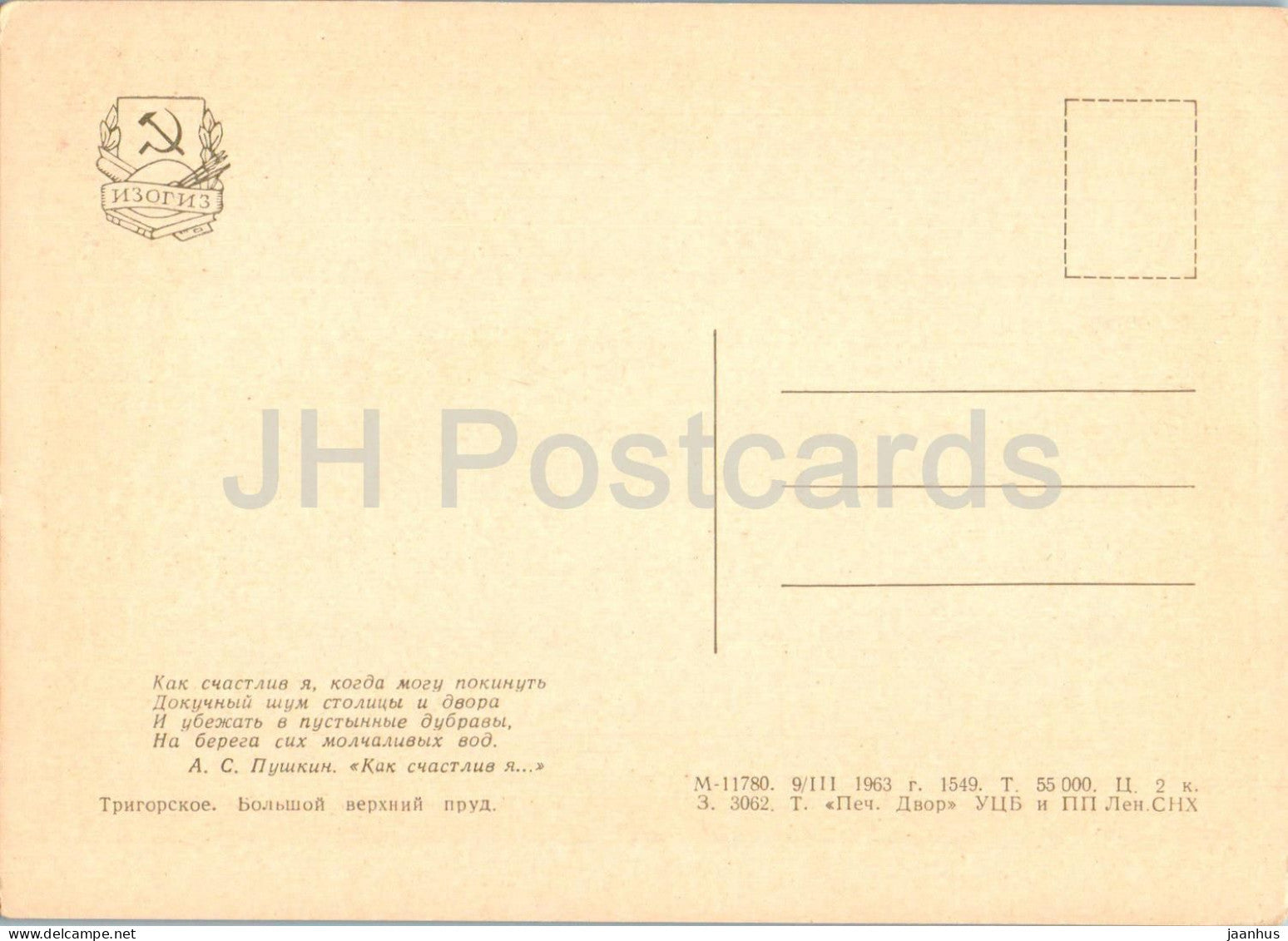Trigorskoye - Great Upper Pond - 1963 - Russia USSR - unused
