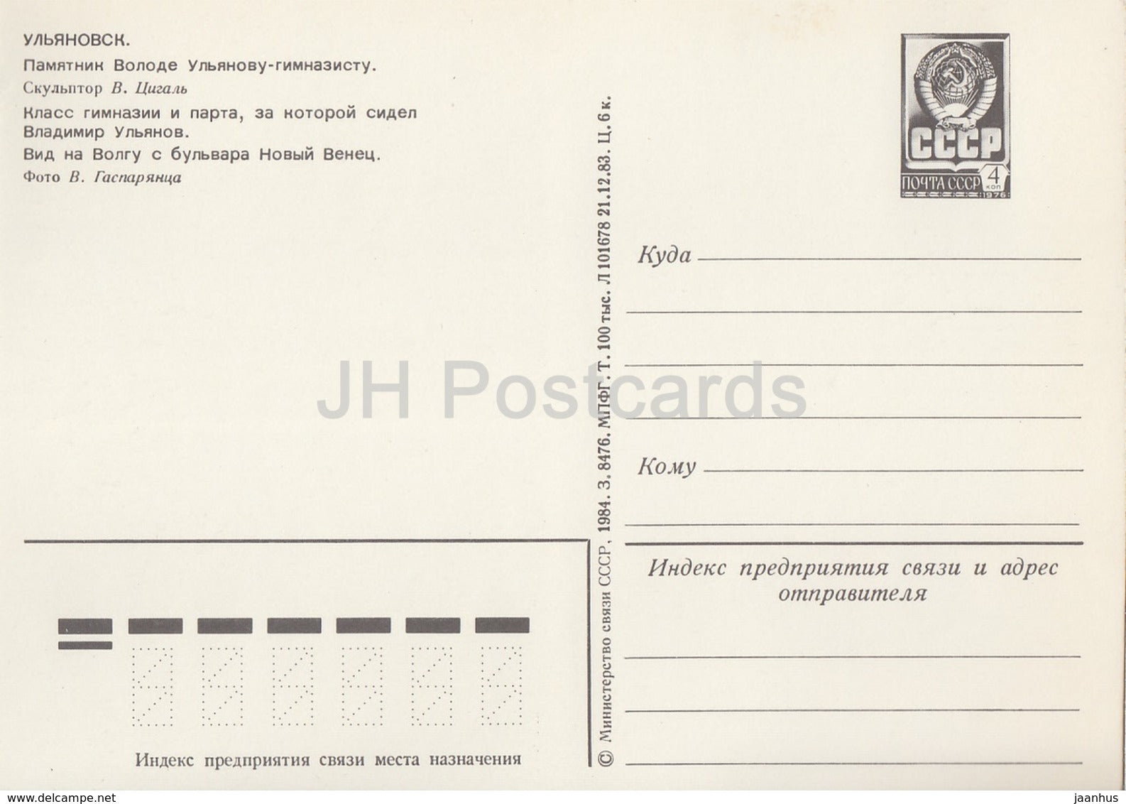 Ulyanovsk - monument to schoolboy Volodya Ulyanov - class room - postal stationery - 1984 - Russia USSR - unused
