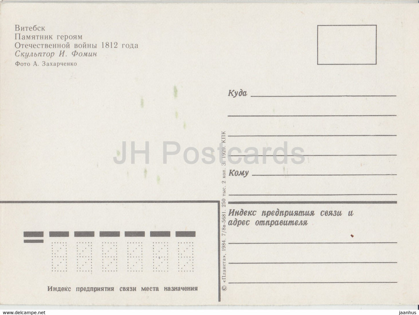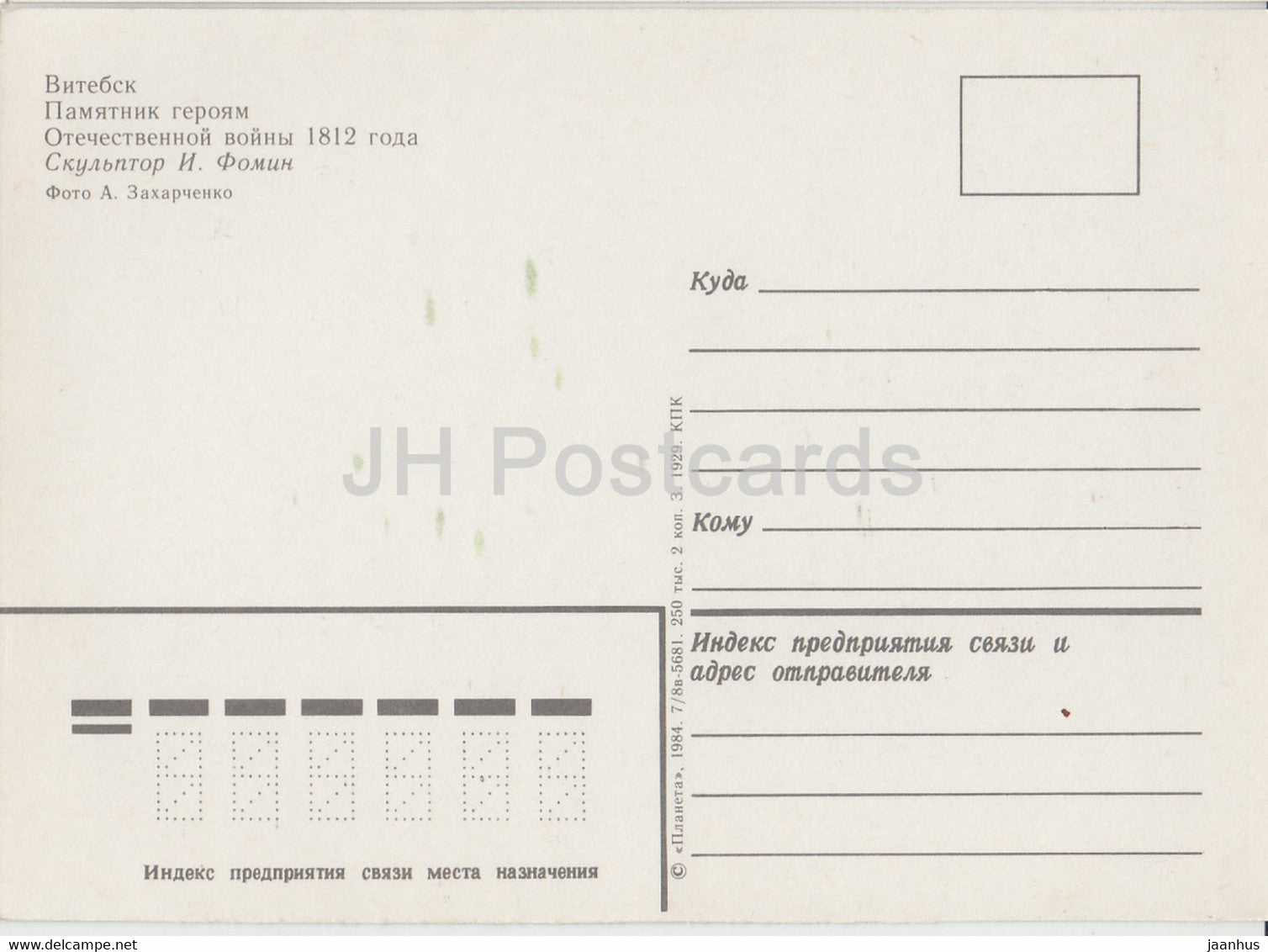 Vitebsk - Monument to the Heroes of the Patriotic War of 1812 - 1984 - Belarus USSR - unused