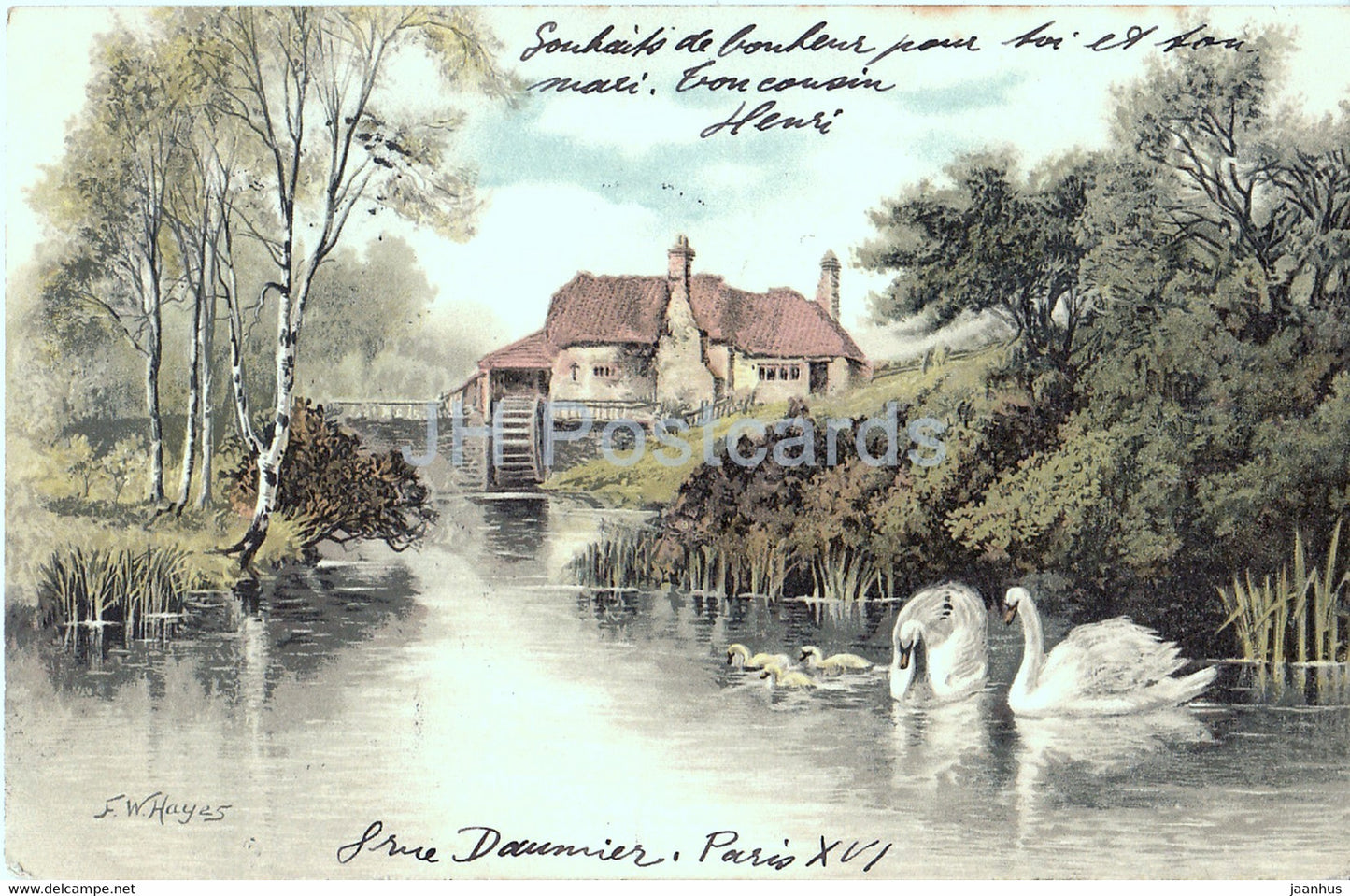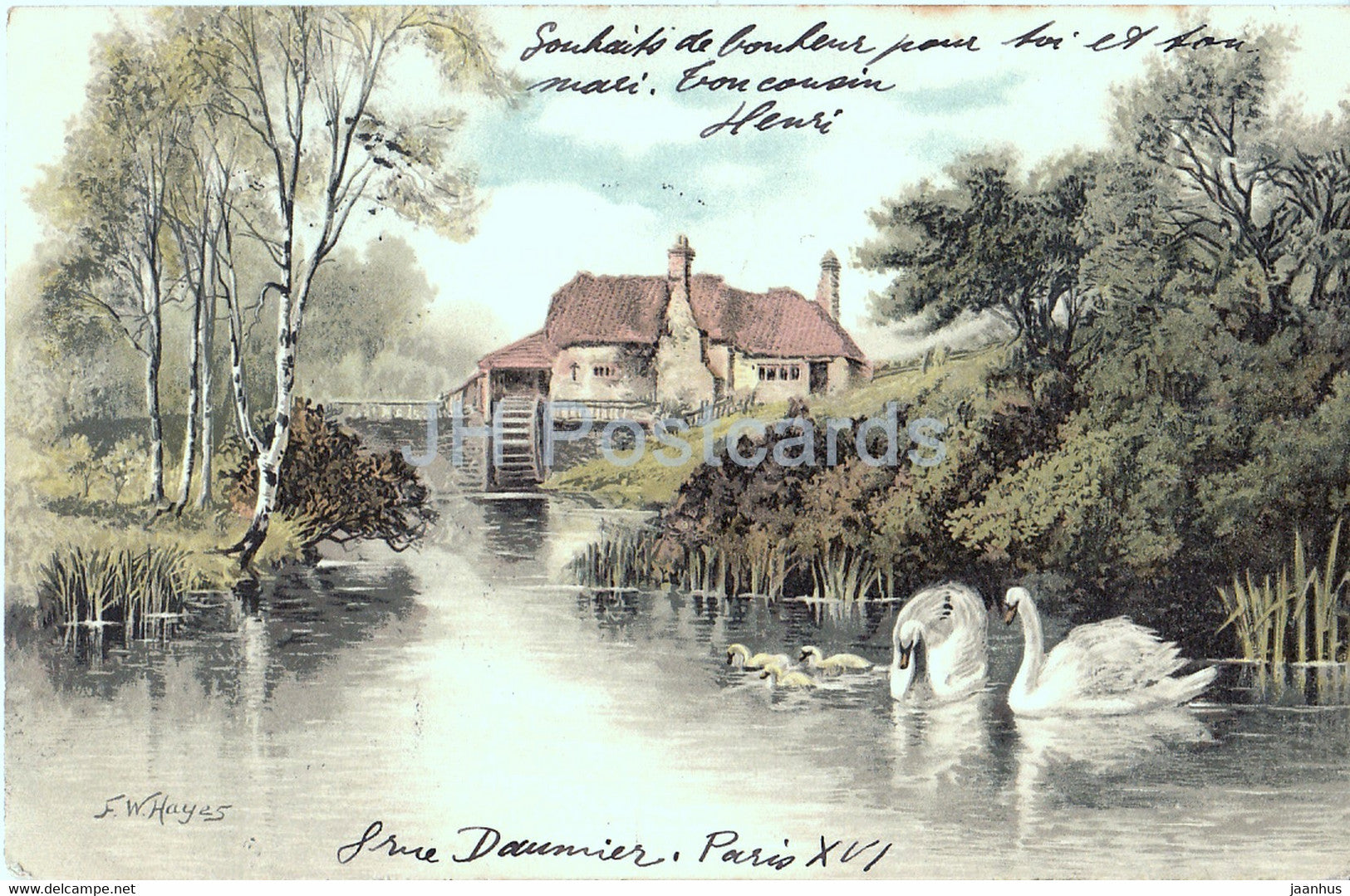 watermill - swan - illustration by F W Hayes - Serie 1189 - old postcard - 1904 - Germany - used