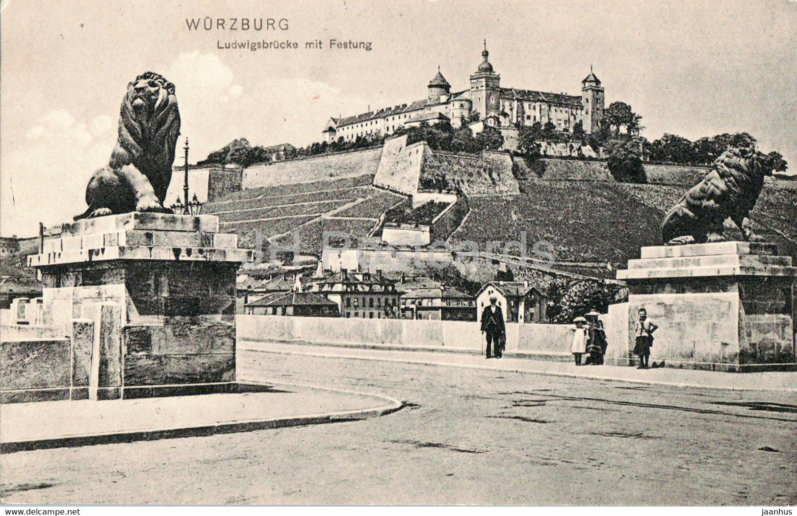 Wurzburg - Ludwigsbrucke mit Festung - lion - sculpture - bridge - old postcard - Germany - unused