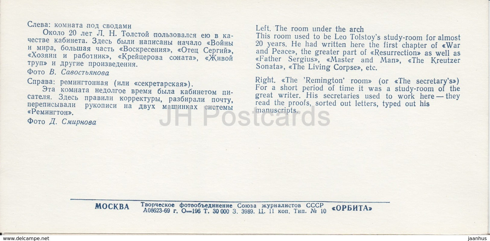 Yasnaya Polyana - The Room under the Arch - Remington room - Leo Tolstoy Museum - 1968 - Russia USSR - unused