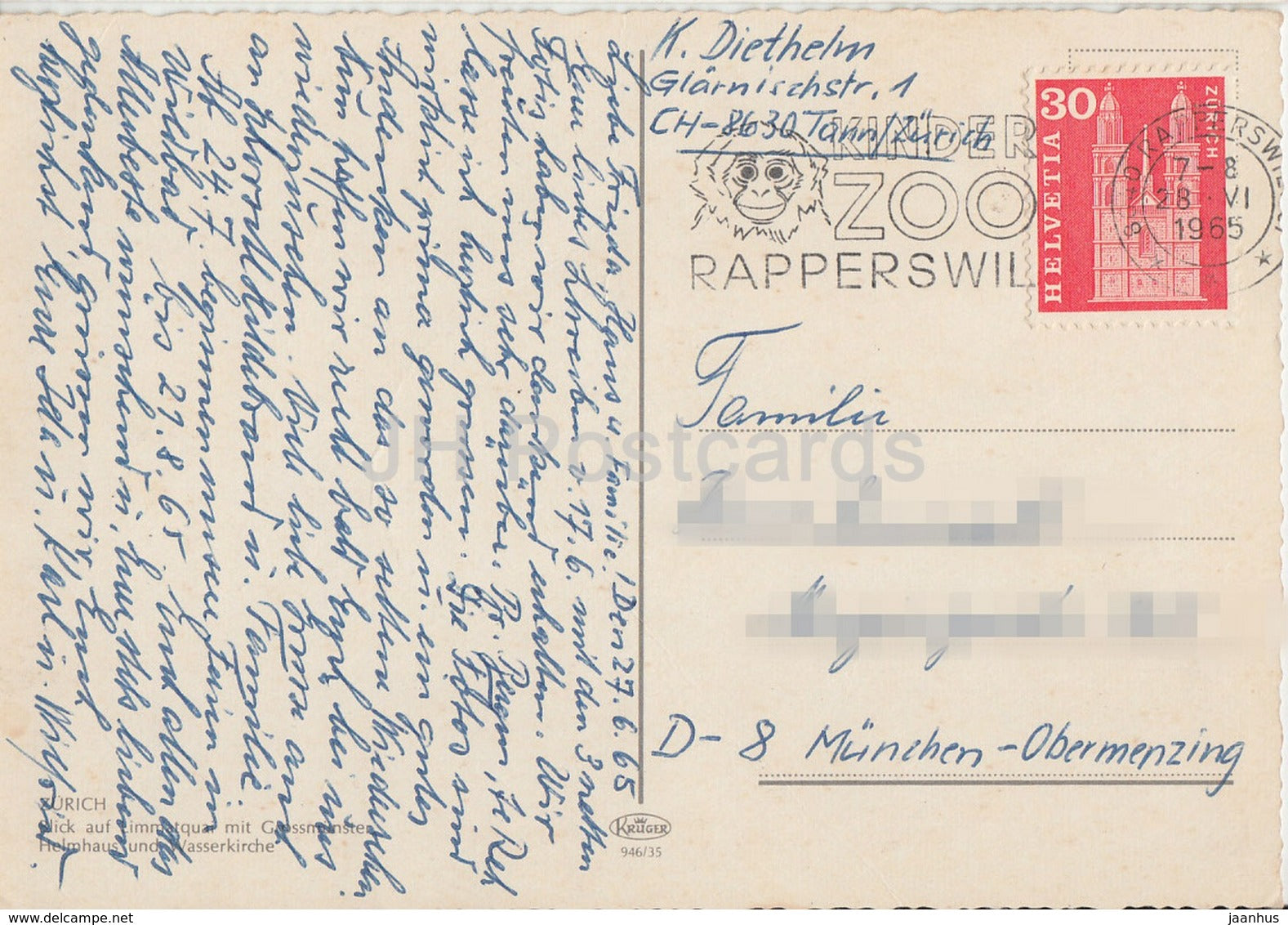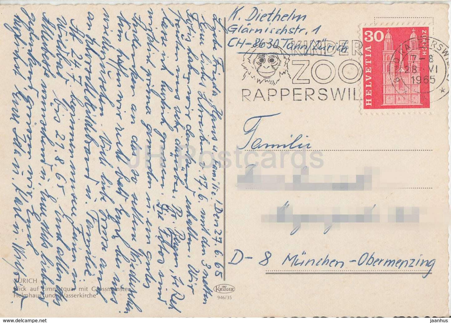 Zurich - Blick auf Limmatquai mit Grossmunster - cathedral - 1965 - Switzerland - used